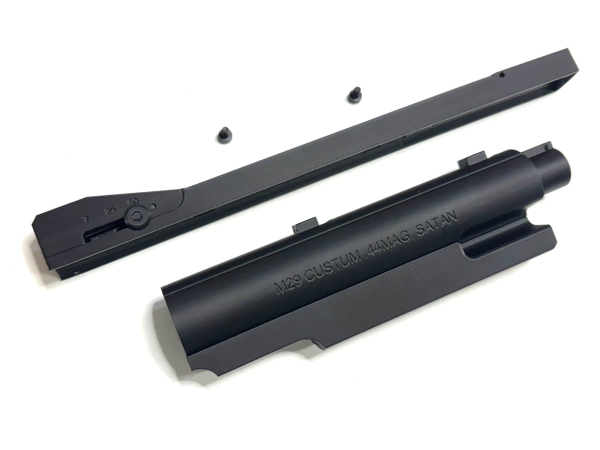 コクサイから発売されていたデビルとサターンM29カスタムを現代に蘇らせた東京マルイM29 6.5in専用のカスタムパーツです。フロント部を交換するだけで簡単にカスタマイズが可能です。FBI競技用に製作されたPPCカスタムを再現できます。分解は簡単でリアサイト側のマイナスネジ2本とフレーム部のピンを抜くだけで取り外しができます。詳しい内容は説明書に記載されております。フロントサイトは3段階に切替可能。材質はABS樹脂になります。