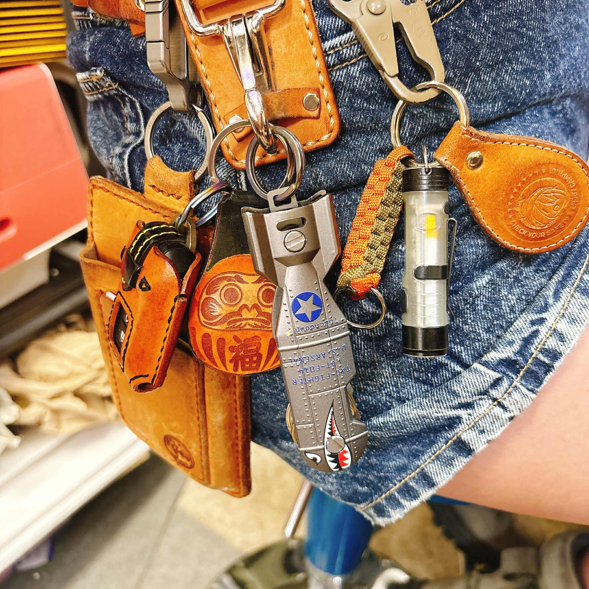 フックには、電子キー、ガソリンスタンドの決済キーホルダー、キーホルダー、Flight Tagなど好きな物を付けられます。